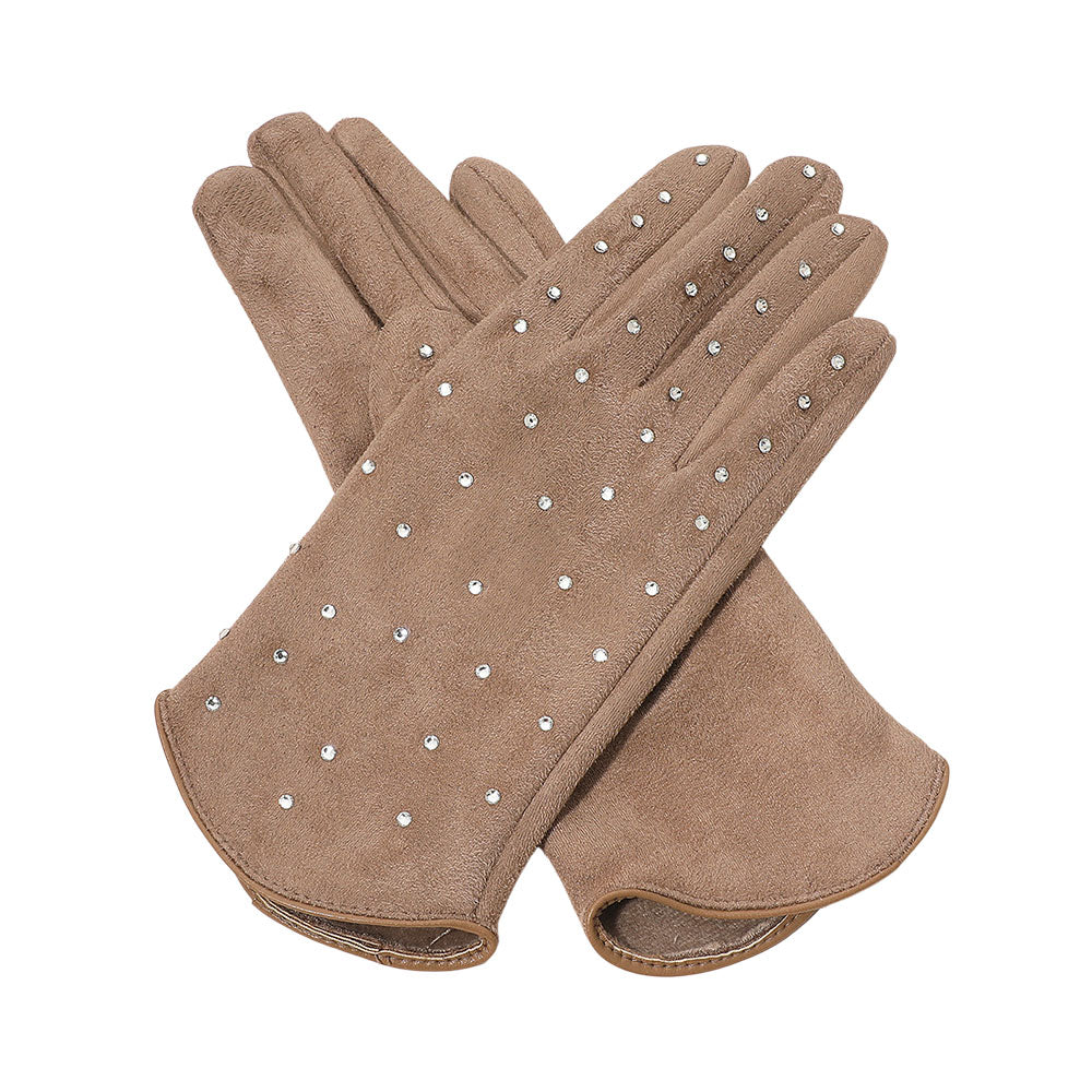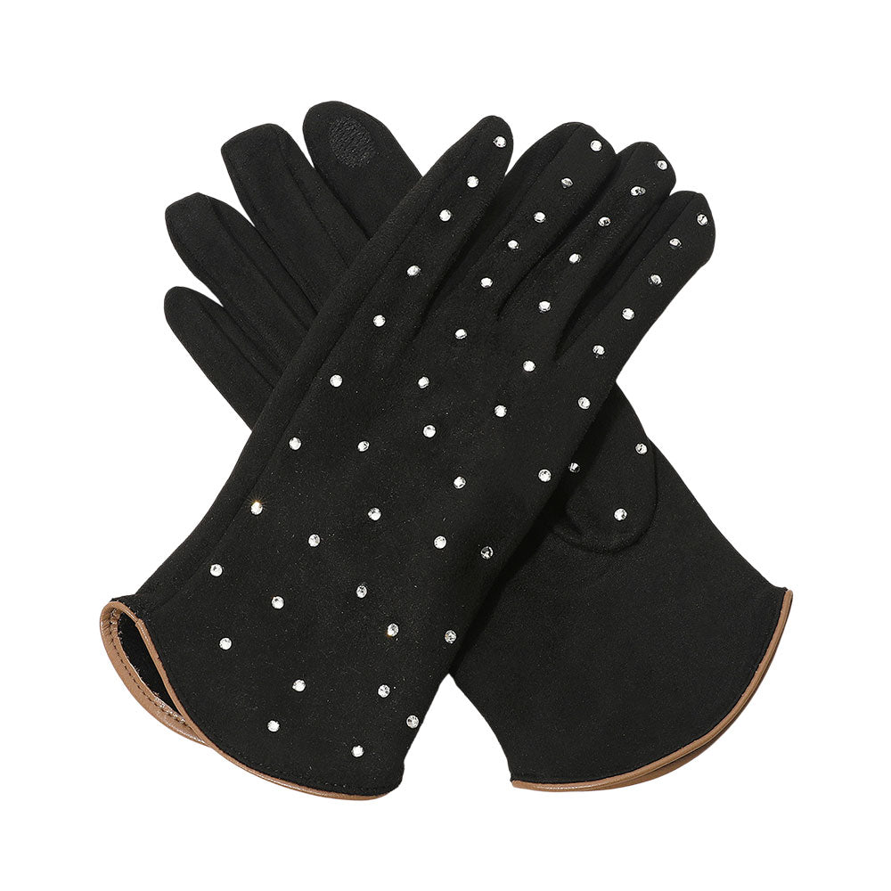 • Elegant smart touch gloves adorned with sparkling rhinestones and a sleek trim finish. These stylish gloves combine comfort with functionality, allowing touchscreen use while keeping hands warm and chic — perfect for both casual outings and sophisticated cold-weather looks.