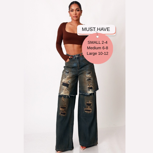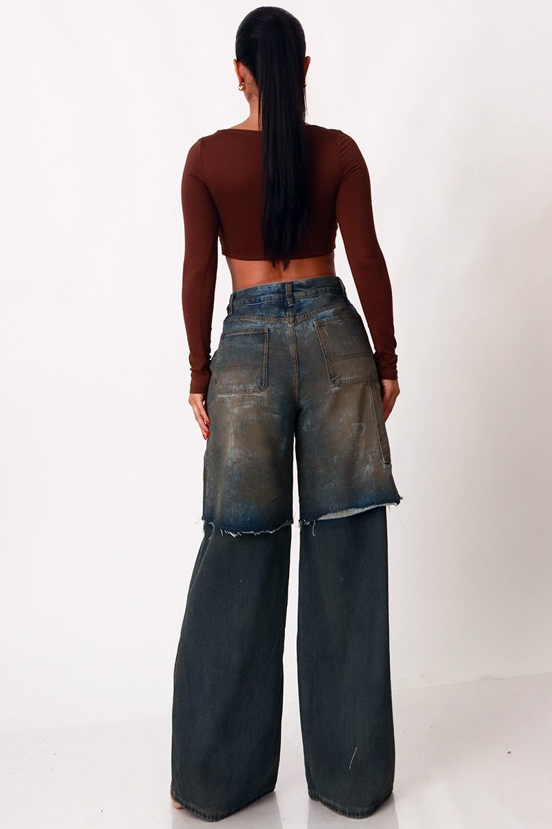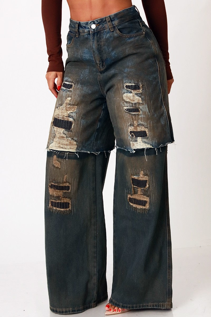 DISTRESSED SKIRT DOUBLE LAYER WIDE LEG DENIM PANTS