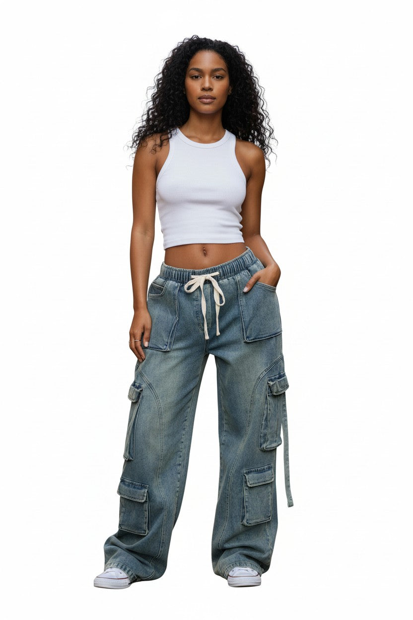Baggy cargo elastic waistband cargo jeans