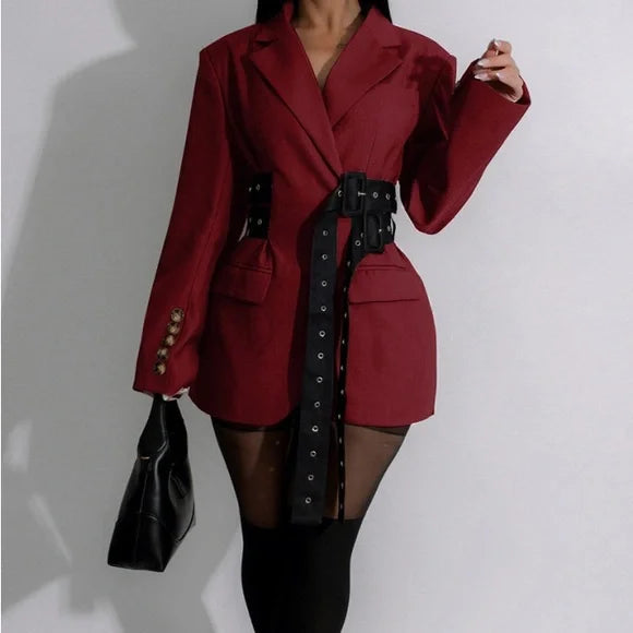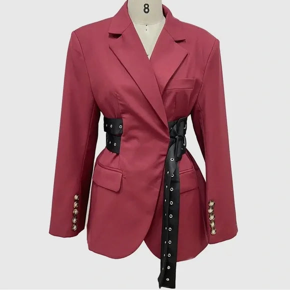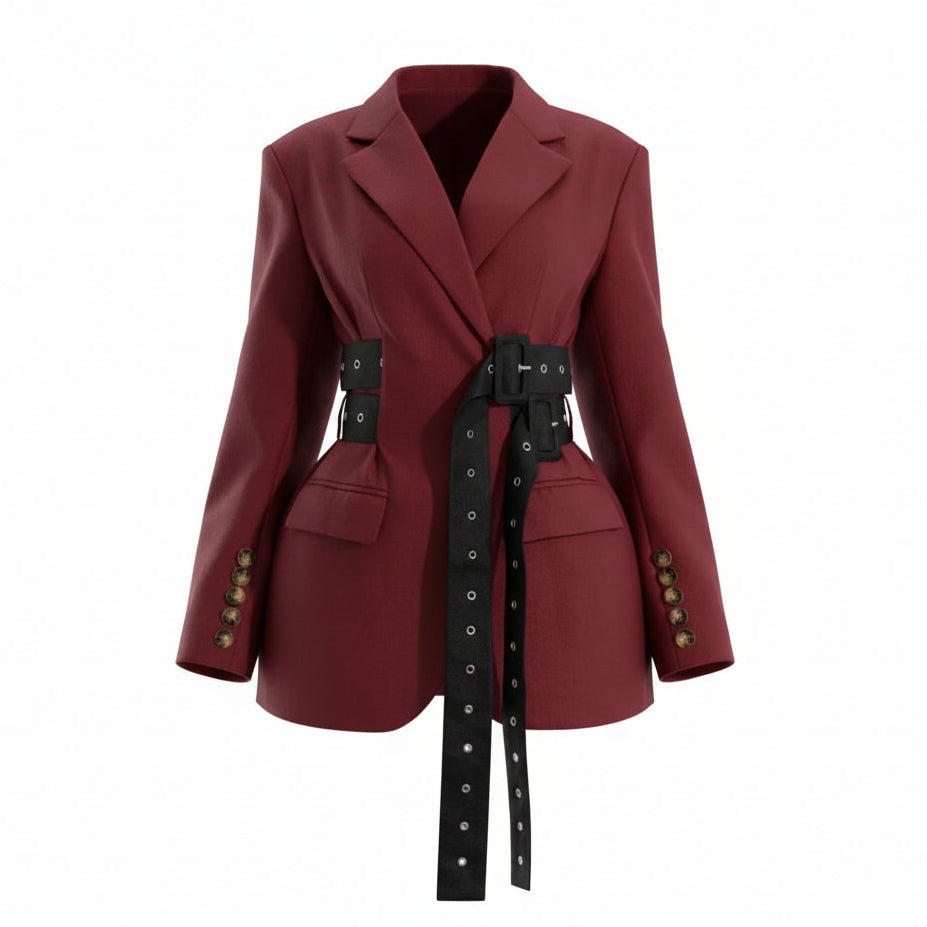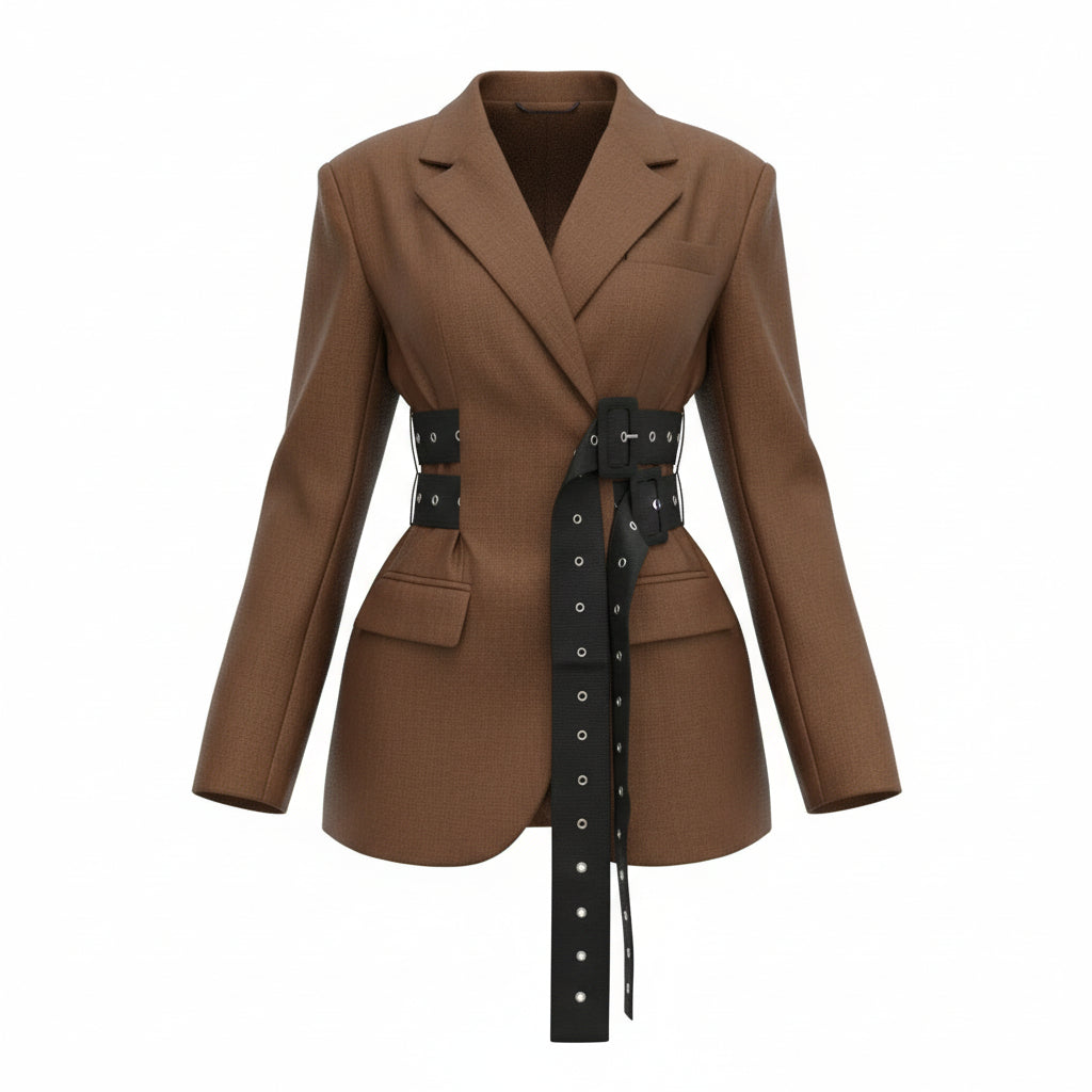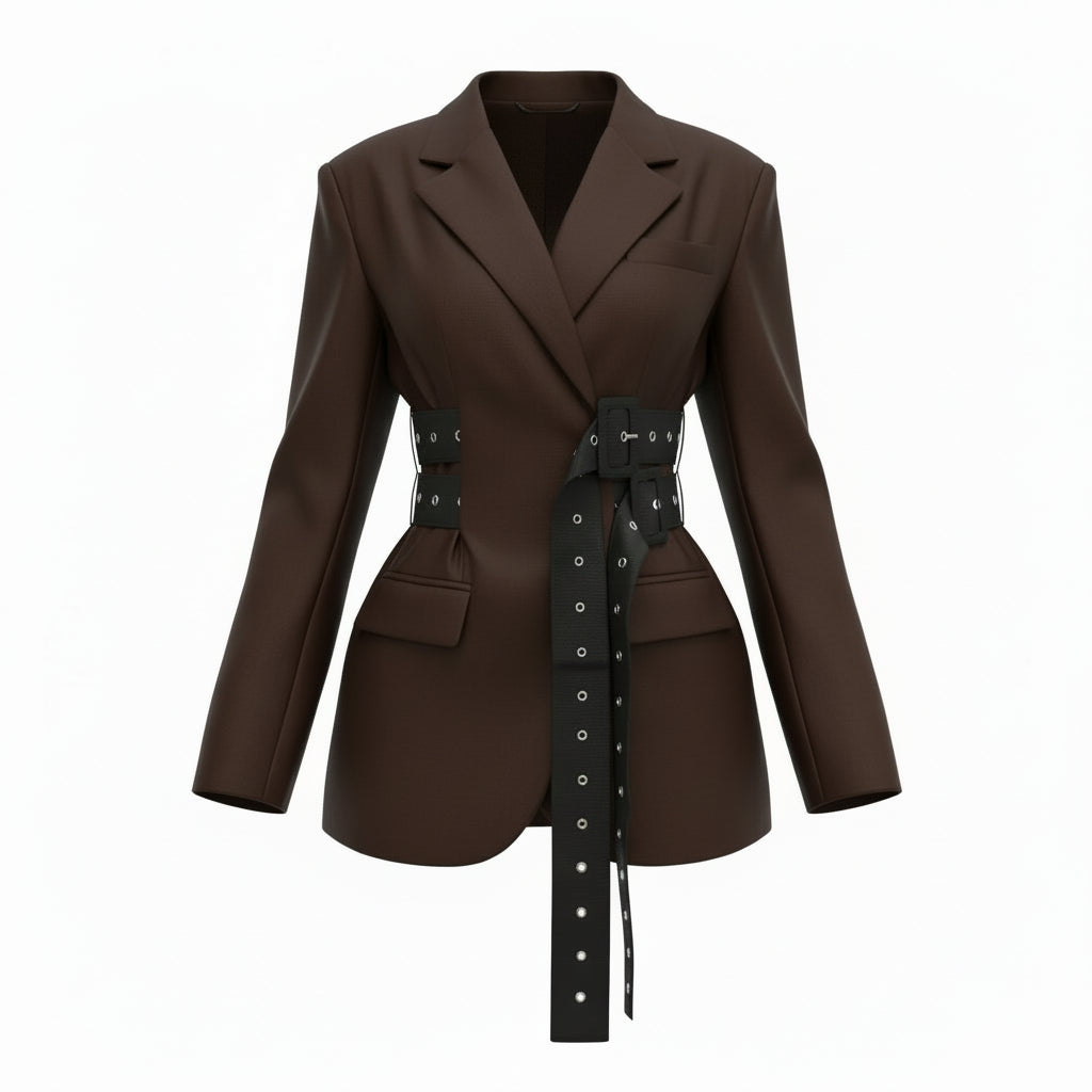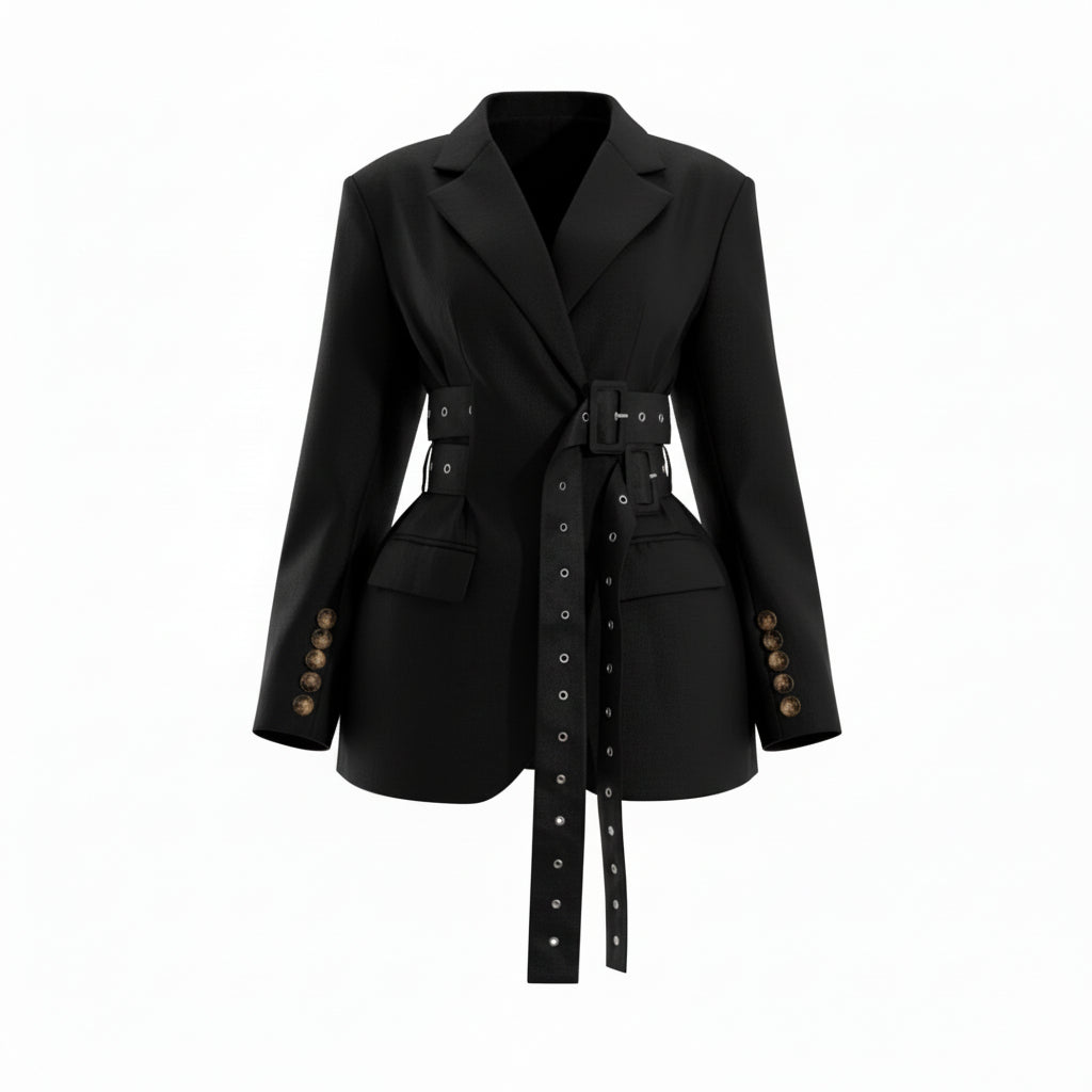 Where sophistication meets modern flair, this blazer commands attention with its sharp tailoring and eye-catching belt detail. Perfect for making a statement, it redefines professional elegance with a bold twist.