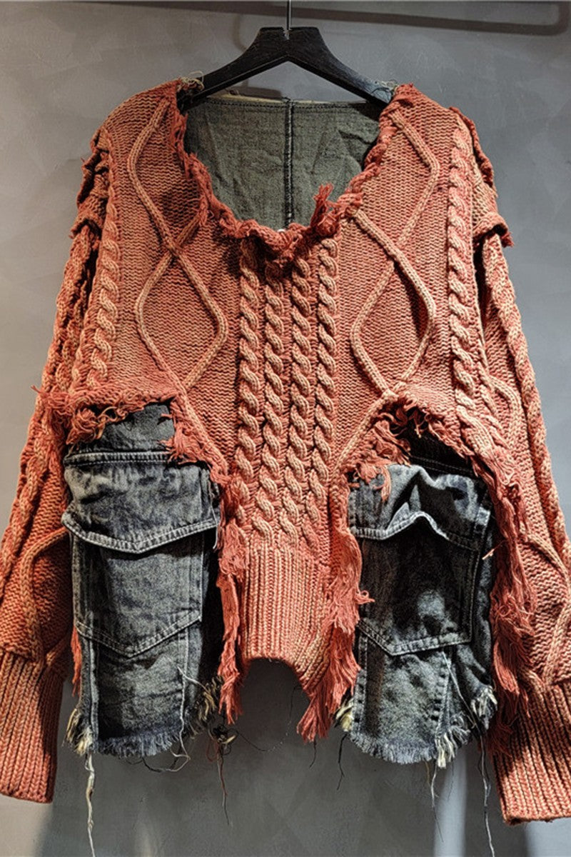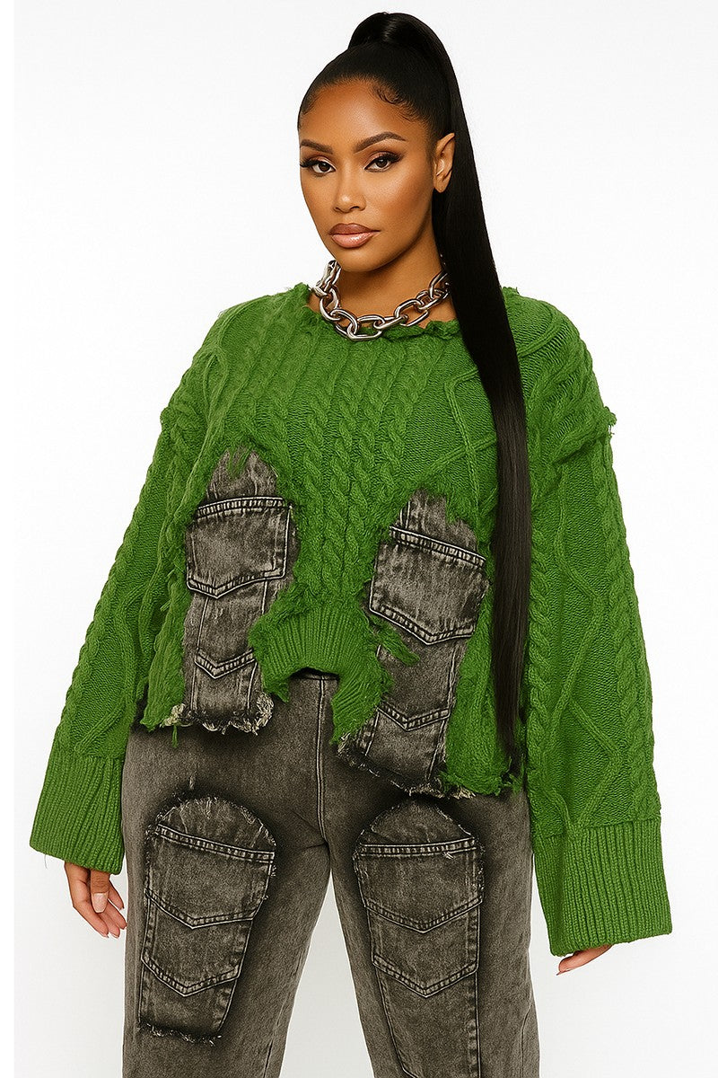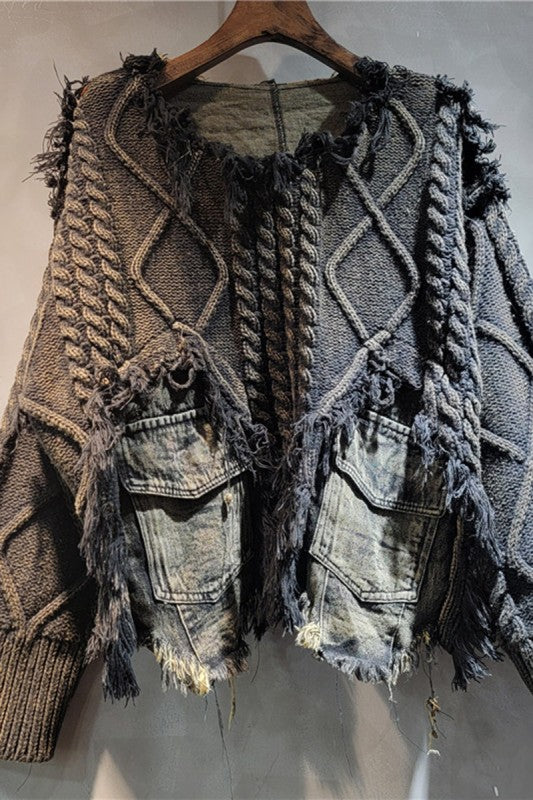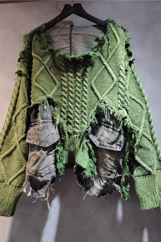 DISTRESSED PATCHWORK CABLE-KNIT SWEATER W/ UTILITY POCKETS