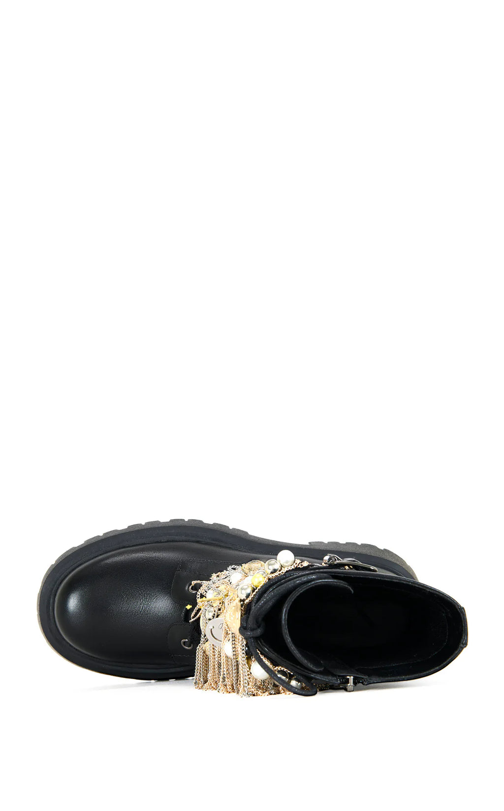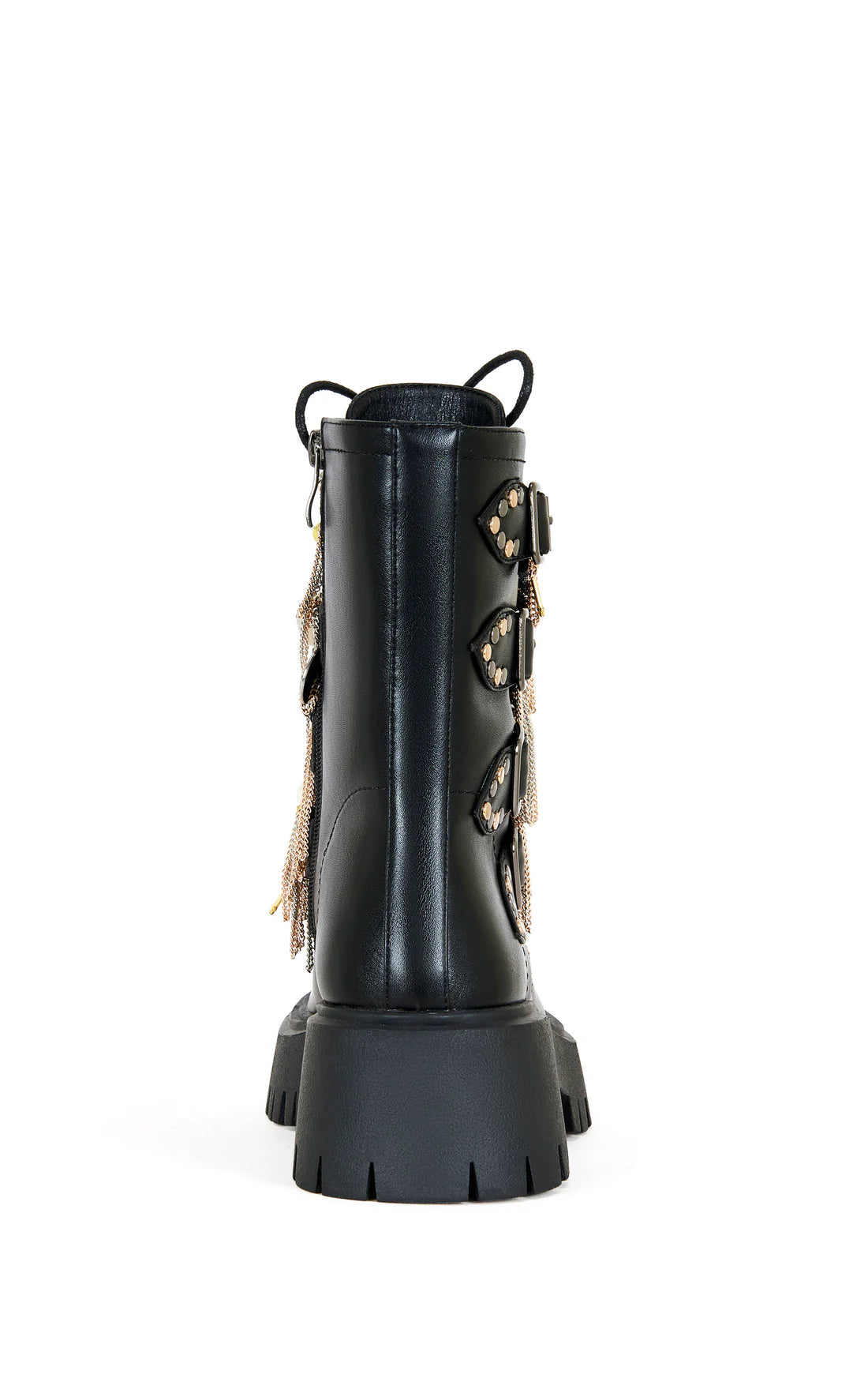 Bring edge and attitude to your shoe-drobe with the AZALEA WANG Megumi Black Metal Hardware Combat Bootie. Crafted from smooth faux leather, this daring ankle boot features a round toe, a chunky heel, a coordinating platform rubber lug sole, a lace-up front accented by multiple adjustable buckle straps adorned with two-tone stud accents, and a cascade of mixed-metal chain and charm embellishments for a maximalist, punk-glam look. Perfect for making a street-style statement.