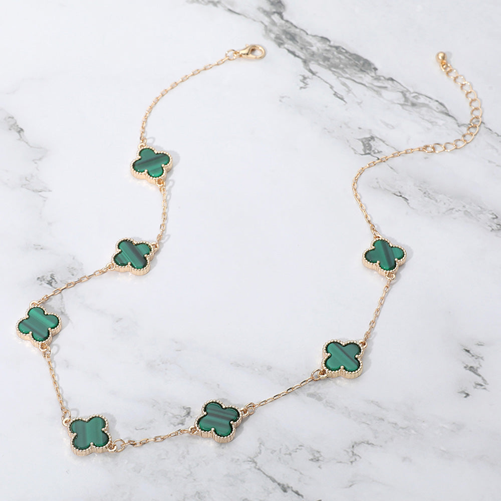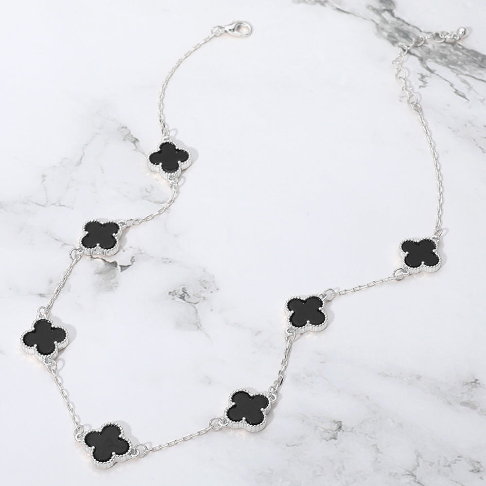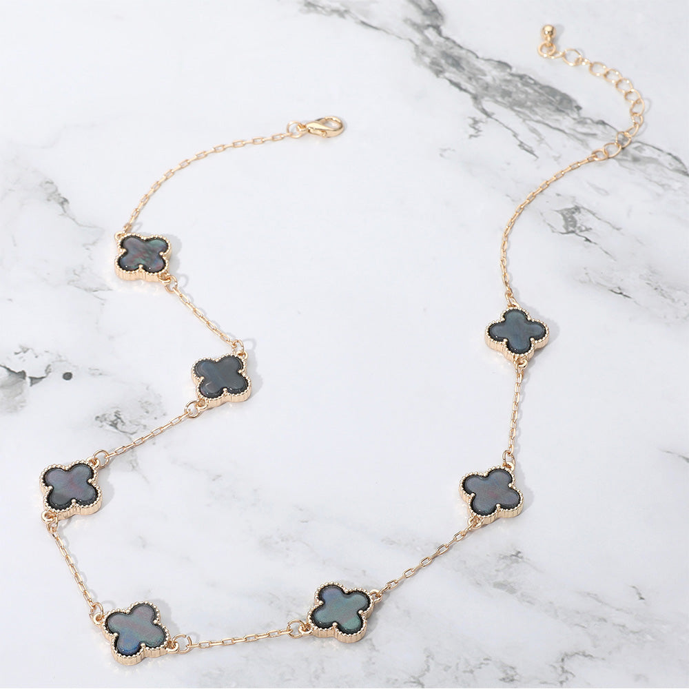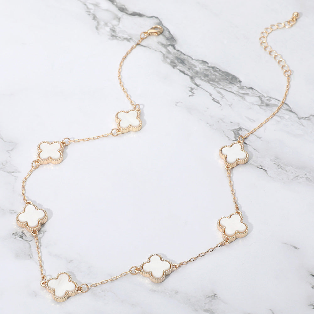 • An elegant quatrefoil charm station necklace crafted with a sleek, modern silhouette. Its repeating clover design adds a refined touch that elevates everyday outfits or special-occasion looks, offering a timeless accessory that blends effortlessly with any personal style.