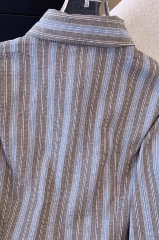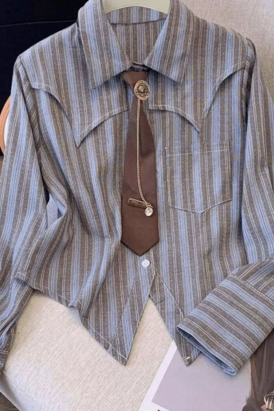 STRIPED DOWN LONG SLEEVE TOP W/ TIE