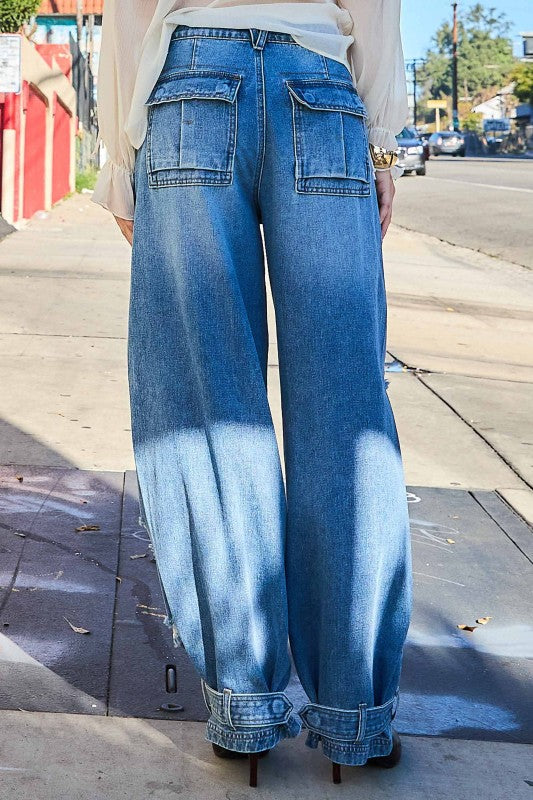 A pair of baggy jeans featuring distress detail, adjustable leg opening with snap buttons, front & back pockets and zip-fly closure.