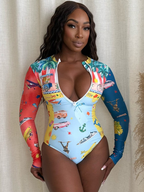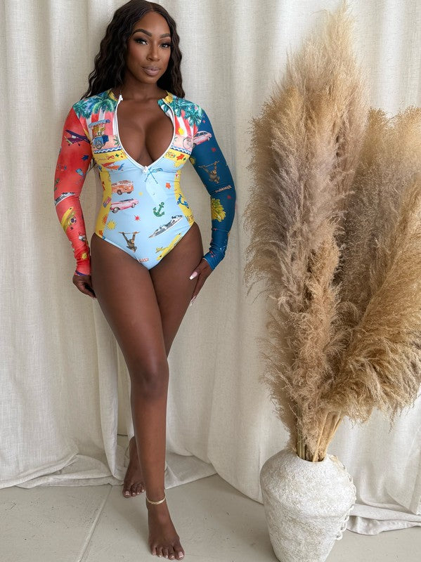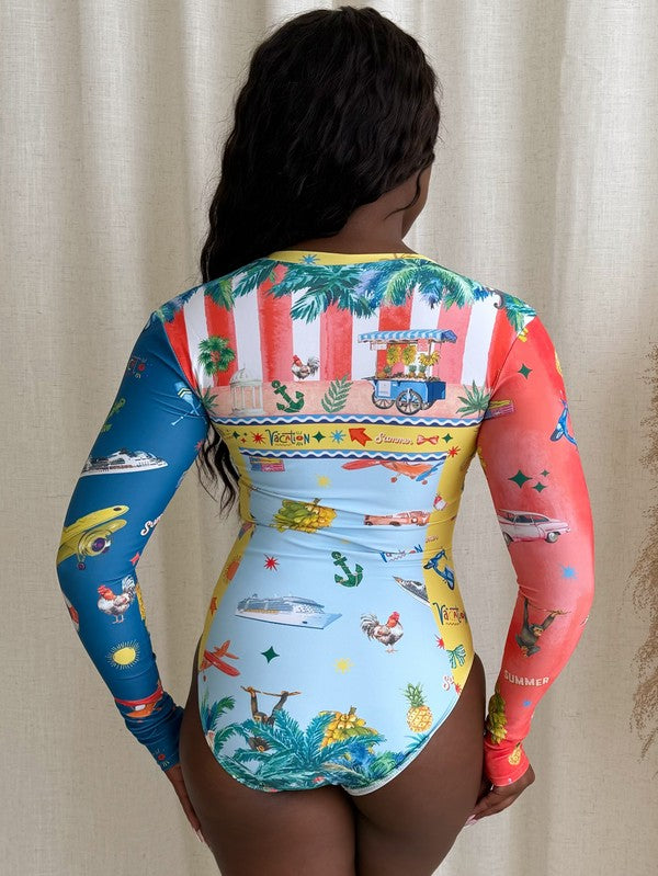 Colorblock one-piece swimsuit with vibrant travel prints & zip front.