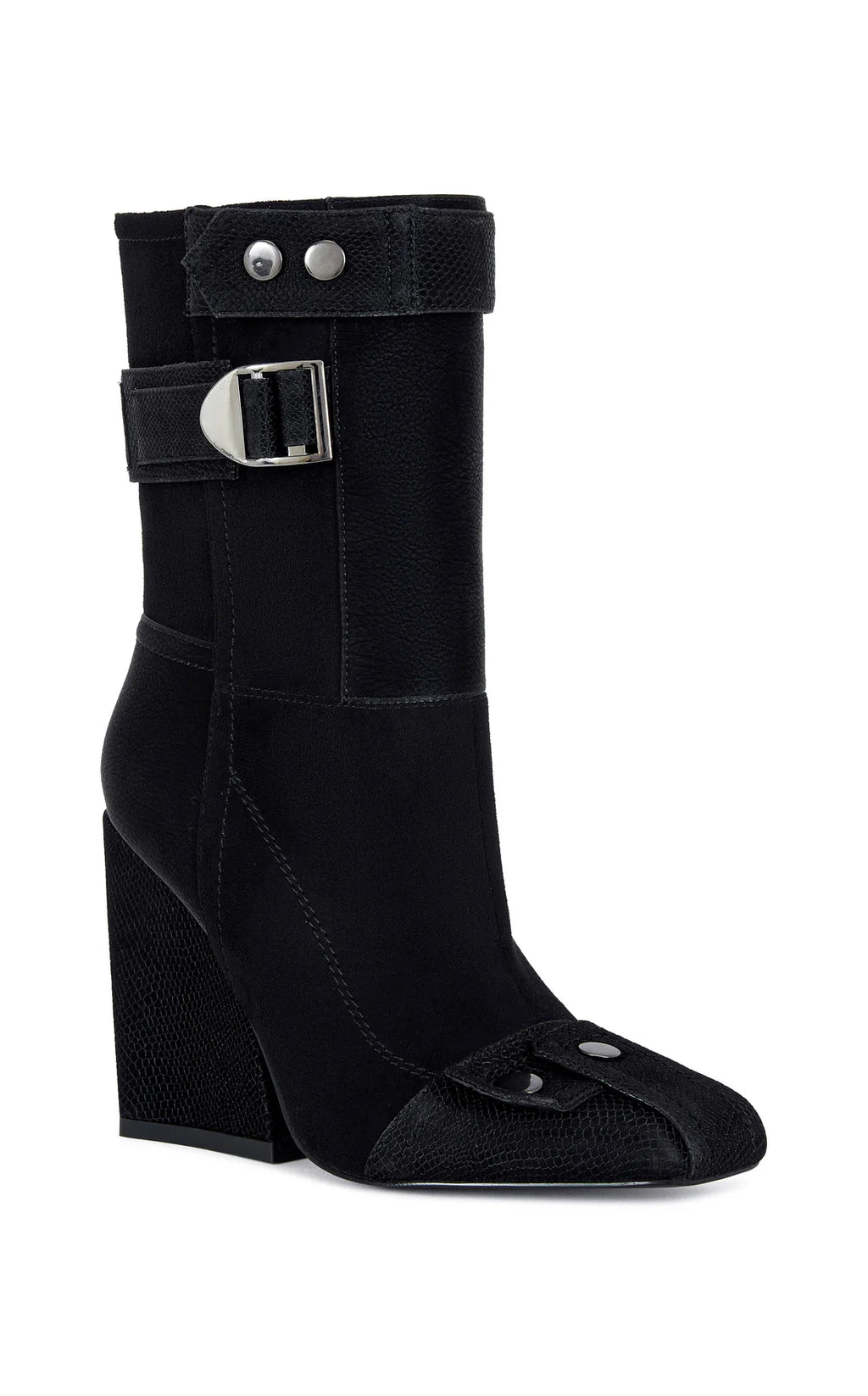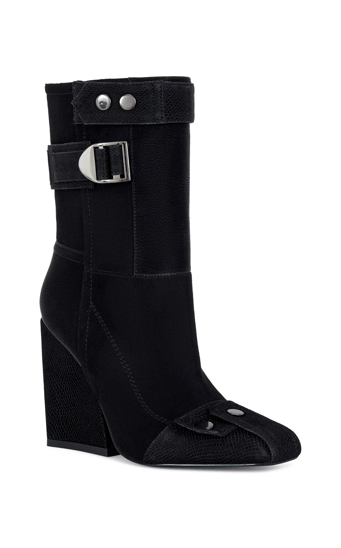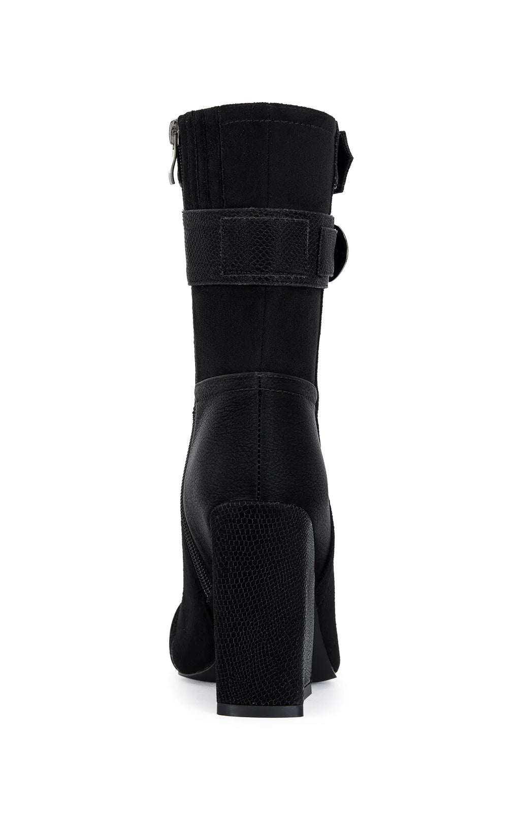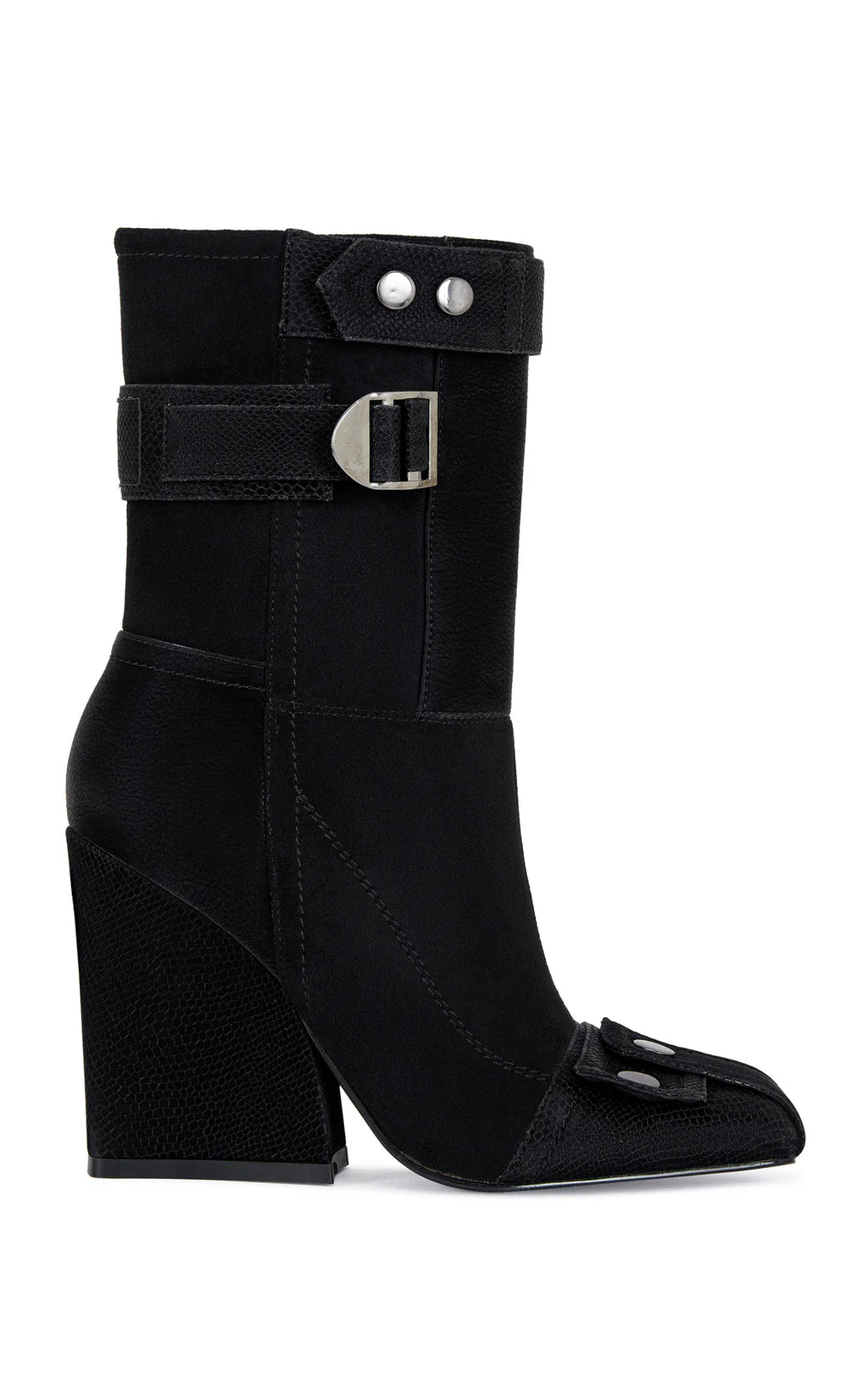 The only thing you need in your life is This classic Bootie. These hotties are crafted from a mix of a faux leather and suede upper and feature a patchwork patterning, an above-the-ankle shaft height, a square toe design with a muted metallic crocodile patterning on the toe cap, a coordinating chunky heel, and strappy belt embellishments on the upper shaft and toe. Complete with faux silver metallic hardware, rounded hems, and an easy, pull-on fit. Style with suede skirts and a button down blouse for a preppy ensemble.