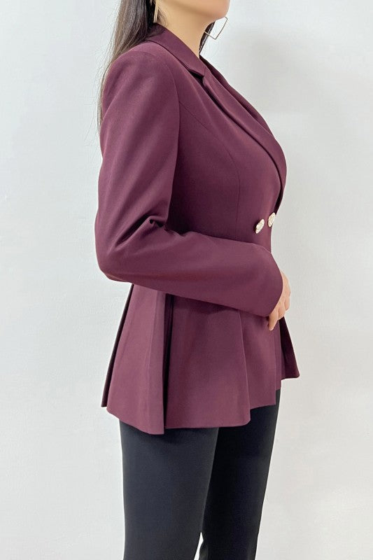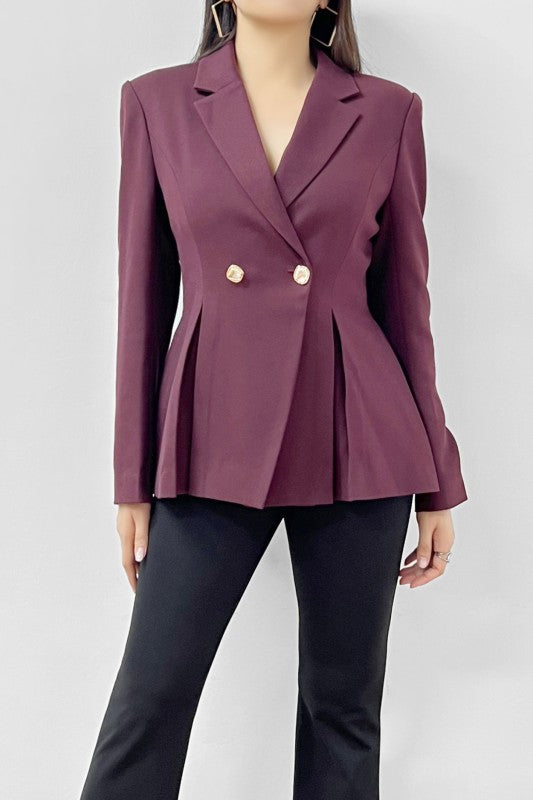 Deep wine red blazer with soft pleats Structured fit with peak lapel Long sleeves and double-breasted front Elegant and modern for office or evening wear